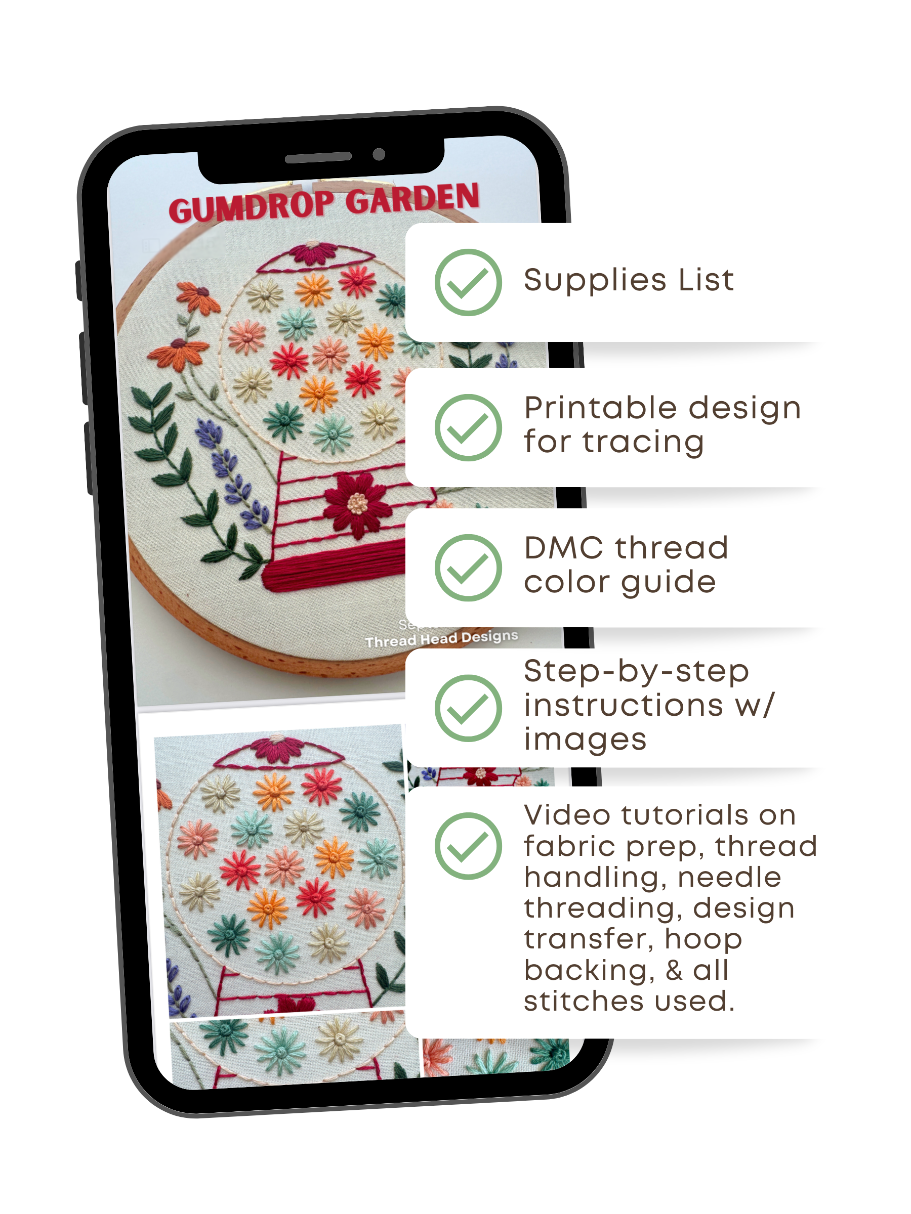 - Video tutorials on: Fabric & hoop prep, thread measuring/separating, threading your needle & tying off, transferring your design, backing your hoop, stitch tutorials for all stitches used in the pattern