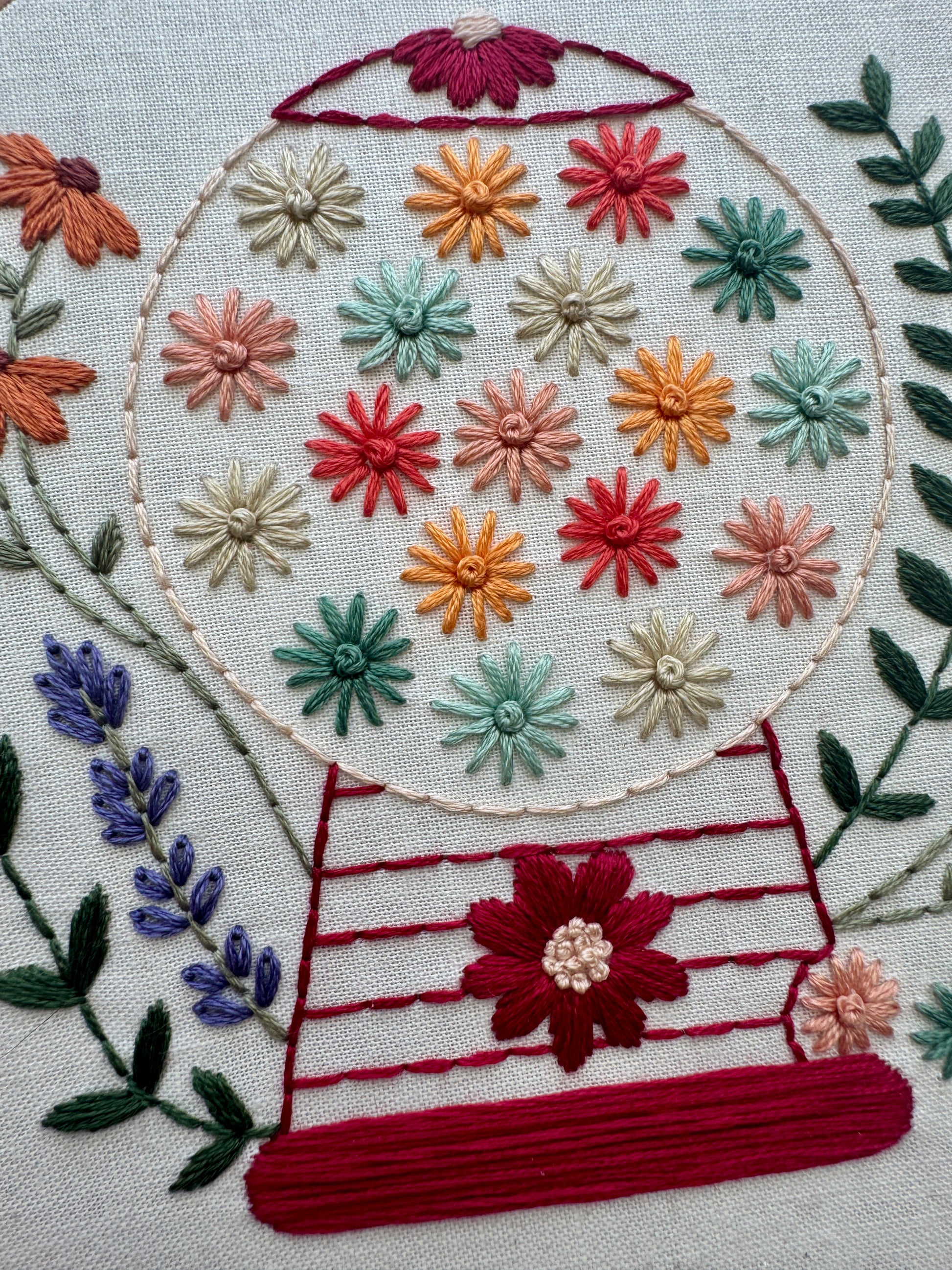 Gumdrop Garden was designed with beginners in mind. Many first-time stitchers have successfully completed it with ease, thanks to my in-depth instructions. This design is for a 6" embroidery hoop.