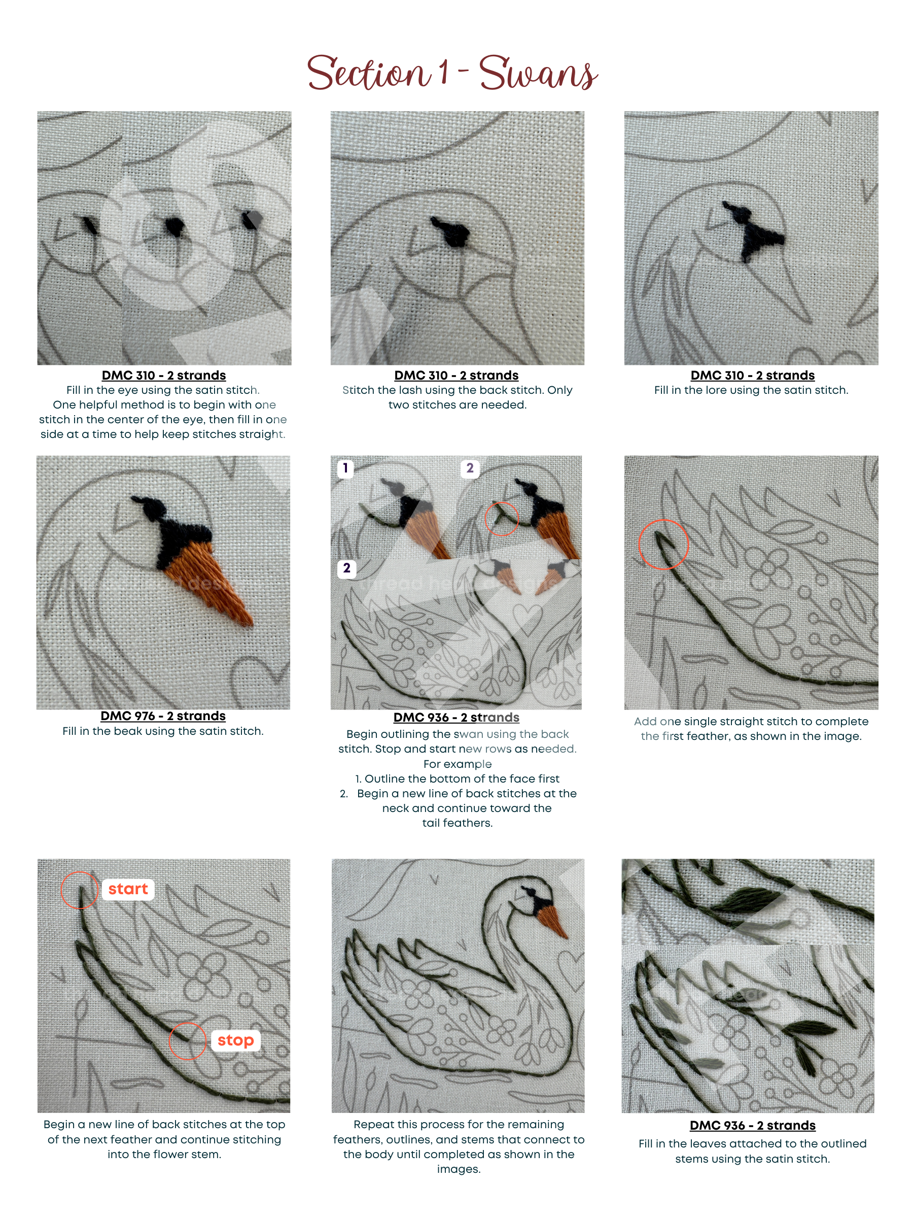 5. Video tutorials on: Fabric & hoop prep, thread measuring/separating, threading your needle & tying off, transferring your design, backing your hoop, stitch tutorials for all stitches used in the pattern